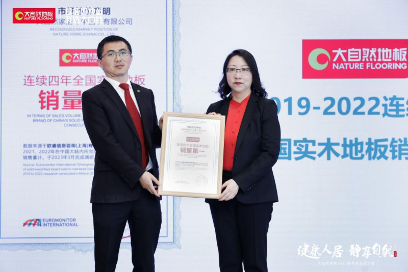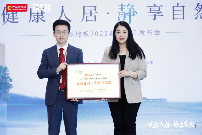 一直以來,大自然地板積極助力綠色健康產品走進更多的家庭,為中國健康人居建設不斷添磚加瓦。發布會現場,中國建筑材料流通協副會長馮斯靜表示:大自然家居旗下的強化地板和實木復合地板,成功入選由工信部公布的全國綠色建材產品清單和企業名錄,其產品質量、安全性、環保性、節能性、低碳化等指標都優于常規產品,因此大自然家居也被中國建筑材料流通協會評審成為“綠色建材下鄉推薦品牌”,現場特授予此榮譽獎牌。