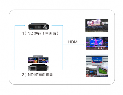 通過矩陣分發(fā)后的NDI信號,可通過千視NDI解碼器(將NDI解碼成HDMI信號)進行單畫面輸出上屏,也可部署NDI多畫面系統(tǒng)實現(xiàn)任意多畫面上屏。對于需要自主播放視頻源的屏幕,如VIP室或休息室的屏幕,千視NDI解碼器可預(yù)設(shè)9個播放地址,通過USB擴展無線小鍵盤,實現(xiàn)多路信號的平滑切換輸出。