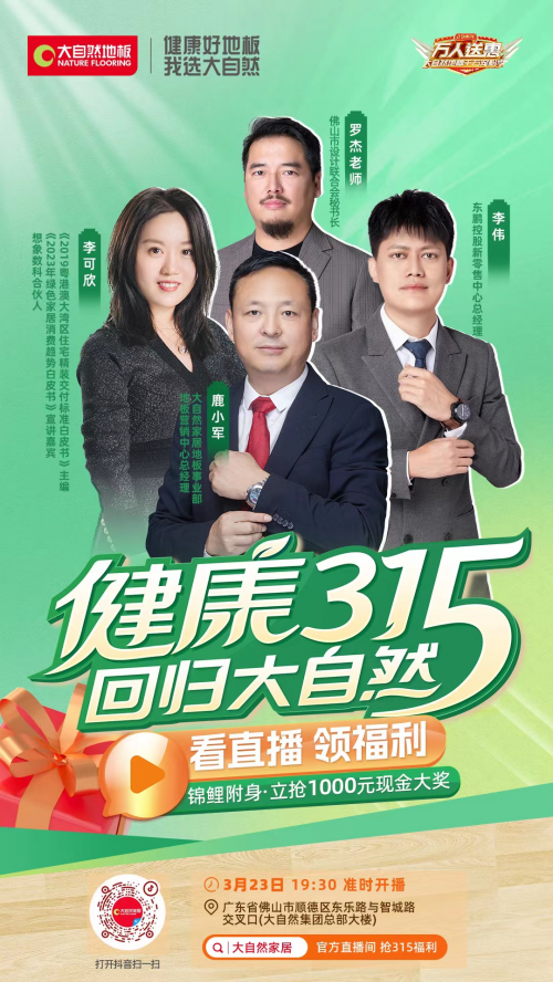 為了給消費者更好的答疑和裝修建議,3月23日大自然地板聯合東鵬瓷磚空降大自然家居官方抖音直播間,并且當晚直播間中將會有神秘嘉賓和重磅驚喜出現!
