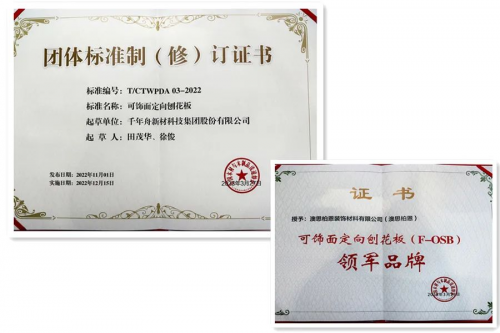 千年舟作為《可飾面定向刨花板》團(tuán)體標(biāo)準(zhǔn)參編單位被授予團(tuán)體標(biāo)準(zhǔn)制(修)訂證書(shū),集團(tuán)旗下澳思柏恩裝飾材料有限公司榮膺“可飾面定向刨花板領(lǐng)軍品牌”。此次標(biāo)準(zhǔn)的順利發(fā)布,標(biāo)志著《可飾面定向刨花板》這一產(chǎn)品有了自己的專(zhuān)有標(biāo)準(zhǔn)。用標(biāo)準(zhǔn)來(lái)規(guī)范化管理該產(chǎn)品在制造、流通、應(yīng)用等各方面的市場(chǎng),將為板材行業(yè)可持續(xù)發(fā)展注入新的活力。