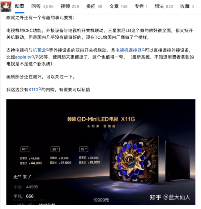 之前裝修的時候因為投影儀很火,沒買電視,但用下來發現投影畫質是真不行,尤其是白天,還是得搞臺好電視。最近在網上發現不少家電大V和行業大佬都在推薦TCL新出的X11G,看完他們的專業測評,對比了下其他產品評測,我也確實覺得X11G夠頂,那就選他了~