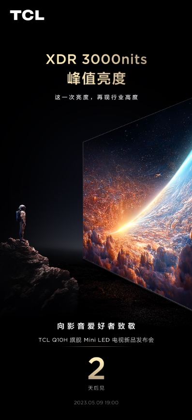 距離TCL Q10H旗艦Mini LED電視新品發布會還有兩天,TCL官方也再度放出倒計時預熱海報,此次預熱海報主要說明的是TCL Q10H將會擁有XDR 3000nits的峰值亮度表現,這在同級別的電視產品中還是相當少見的。