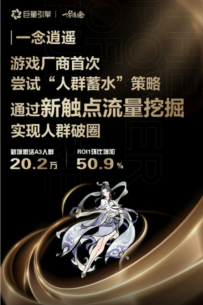而在流量成本越來越高的游戲行業,依靠數據和科學的營銷工具、方法,想要復制《一念逍遙》投放成本不升反降的“反常”現象也有跡可循。去年6月的版本更新大推中,業內率先探索全域經營方法論,試水"蓄水+轉化”的5A人群運營策略,5A人群拉新5119萬,打破慣有短線經營思路,為行業樹立新標桿。