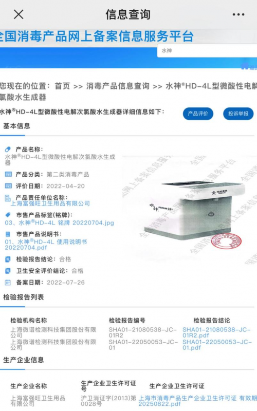 以旺旺家的水神HD-4L消毒機為例,備案名稱、生產單位、相關說明書及檢測報告等一應俱全,這種就是備案過的。