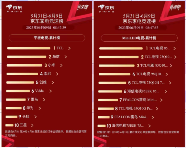 在具體的單品排名中,TCL同樣表現出色,像是在Mini LED電視領域幾乎以刷榜的優勢占據了排行榜前十中的八位,其中排名前五的也均為TCL品牌的電視,這也在另一方面彰顯了TCL Mini LED電視的產品力優勢。