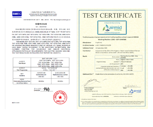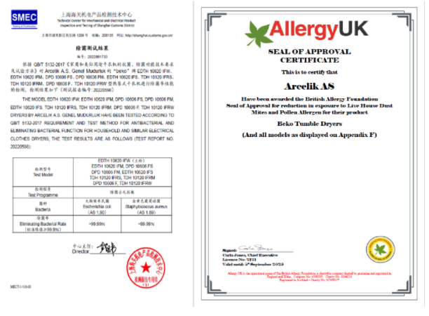 *上海海關機電產品檢測技術中心報告,報告編號2022061732,除菌去毛抗敏程序下,對于大腸埃希氏菌和金黃色葡萄球菌的除菌率均>99.99%;英國過敏協會認證,證書編號2121,干衣后有效減少暴露于室內塵螨及花粉等過敏原