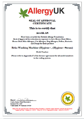 *英國過敏協會認證,證書編號739,蒸汽除菌抗敏程序洗滌后,有效減少暴露于室內塵螨、貓過敏原、狗過敏原、花粉、細菌和真菌