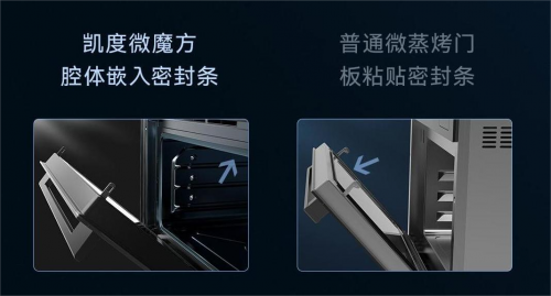 其次,凱度「微魔方」系列新品運用了專利級的密封技術,該技術能夠強力封印蒸汽和微波。不同于市場上絕大多數微蒸烤箱將密封條設計在門板上,凱度創新性地將密封條設計在腔體上,從而有效擴大了空間,耐超高溫密封條的寬度提升了約1倍,吸附力得到了大幅提升。這種設計使得密封條與腔體更為貼合,使玻璃門板更平整,貼合度更高,進而提升了高達3倍的微波防泄漏密封效果!此外,微魔方還采用了可更換和可調整的密封條設計,方便取裝,無懼老化和壓力變形。
