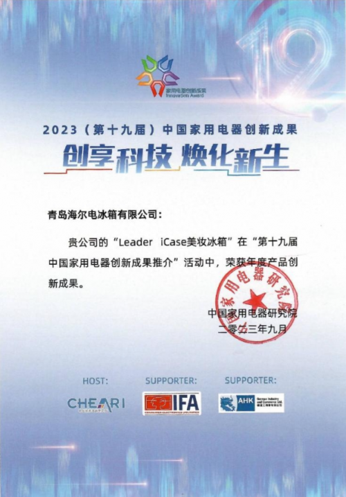 9月1日,Leader iCase小仙貝美妝冰箱憑借首創的底部制冷科技和智慧管理功能,斬獲第十九屆中國家用電器創新成果發布盛典“年度產品創新成果獎”,成為行業首個獲得此獎項的美妝冰箱。
