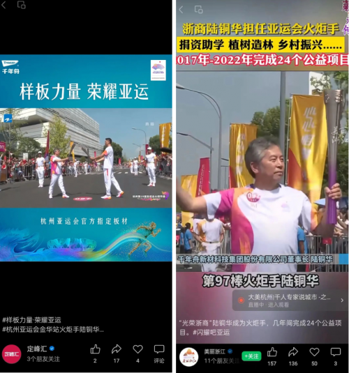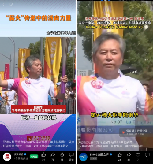 此次千年舟集團(tuán)董事長(zhǎng)陸銅華擔(dān)任亞運(yùn)會(huì)火炬手,不僅得到了廣大民眾的歡呼和鼓勵(lì),更得到了浙江多個(gè)主流媒體的轉(zhuǎn)載與采訪(fǎng),包括由浙江省人民政府新聞辦公室推出,浙江廣電集團(tuán)運(yùn)營(yíng)的“美麗浙江”、浙江經(jīng)視、FM93交通之聲、定峰匯等新媒體賬號(hào)第一時(shí)間進(jìn)行了跟進(jìn)報(bào)導(dǎo),權(quán)威力量的發(fā)聲再一次奠定了千年舟集團(tuán)巨大的品牌影響力。