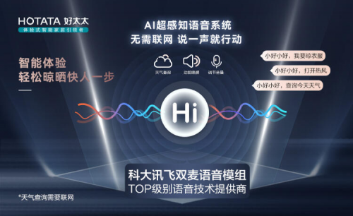 另外這款好太太智能晾衣機還配置了AI超感知語音系統,在晾衣服時通過簡單的語音指令控制智能晾衣機,而且支持離線語音無需聯網,一句“小好小好,我要晾衣服”,晾衣桿就會下降到方便晾曬衣物的位置,不用費力手搖也不用麻煩去找遙控器,家務勞動變輕松,幸福感自然上升。