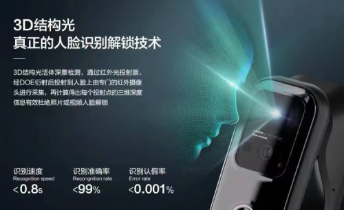 3D結構光活體深景檢測技術是通過紅外光投射器,將具有一定結構特征的光線投射到人臉上,形成數萬個散斑點,再由專門的紅外攝像頭進行采集,并與預錄入人臉進行比對,完全符合才啟動開鎖模式,試圖用照片或視頻人臉解鎖是不可能的,而且它的人臉識別速度小于1秒,不僅安全而且足夠快速。