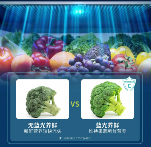BIueLight藍光養鮮+保濕濾膜,賦能果蔬鮮活養分。用藍光模擬自然光,讓食材繼續進行光合作用。維持果蔬內VC含量。保濕濾膜設計,能將果蔬盒內濕度恒定維持在91%*,滿滿水汽鎖住蔬果脆爽口感。