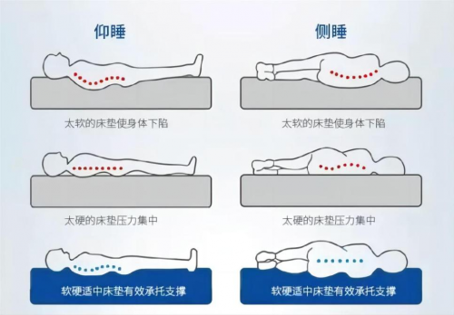 其實,這兩種說法都有道理。太軟的床墊缺乏支撐力,較重的腰部和臀部就會向下彎曲,影響脊椎的生理曲度。太硬的床墊導致臀部、肩部成為主要受力點,而腰部處于懸空的狀態,會引起肌肉緊繃和勞損。所以,選床墊不能極端,太硬或者太軟都會導致腰酸背痛。