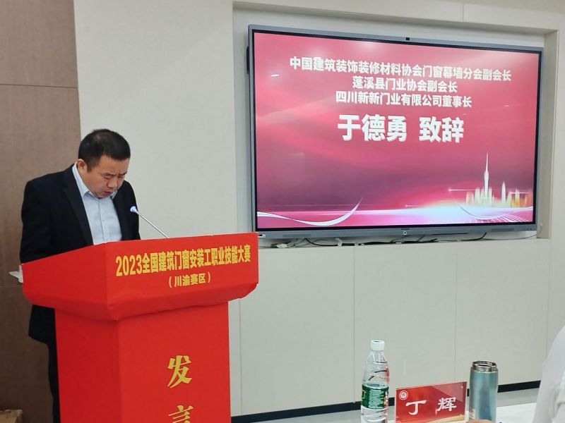 緊接著,分會副會長、蓬溪縣門業協會副會長、四川新新門業有限公司董事長于德勇先生表示,作為本次大賽的承辦單位,感到無比榮幸。建筑門窗安裝工職業技能大賽不僅是一次技術交流和競技的舞臺,更是推動行業發展和人才培養的重要平臺。希望通過這次比賽,能夠讓更多的人了解門窗安裝工這個職業,提升社會對這個行業的認知度和尊重度。新新門業為這次大賽提供全方位的支持和保障,確保每位選手都能發揮出最佳水平,共同為提升建筑門窗安裝行業的整體水平而努力,并衷心祝愿本次大賽取得圓滿成功!