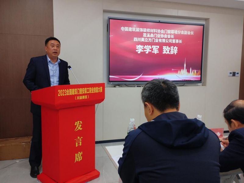 隨后,分會副會長、蓬溪縣門業協會會長、四川美立方門業有限公司董事長李學軍先生,熱烈歡迎來自川渝賽區的安裝工師傅們參與本次大賽,并向一直以來默默耕耘在門窗行業,兢兢業業助推行業高質量發展的工作者們表示由衷的感謝!在過去的十年里,“蓬溪門”在產業轉型中迅速崛起,成為全國唯一的縣級門業產業集群。本次舉辦職業技能大賽和職業人才評選表彰是激勵我們門窗行業廣大技術勞動者們努力鉆研技術業務,提供勞動者整體素質的重要策略,對樹立現代化科學的人才觀,提高技術工作者的社會地位,形成全社會尊重技能、尊重技術人才的社會氛圍具有重要意義和作用。本次大賽始終秉持著“公平、公正、交流、選才”的宗旨,搭建門窗安裝交流平臺,讓門窗行業安裝工精英們匯聚一堂,切磋技能,交換建筑門窗安裝心得,共同營造積極向上,相互學習的門窗技術安裝環境;竭誠營造尊重技能、崇尚技能的行業氛圍。在接下來的比賽中,愿大家賽出友誼,賽出水平,從而更大力度的推動門窗行業企業高質量飛速發展。