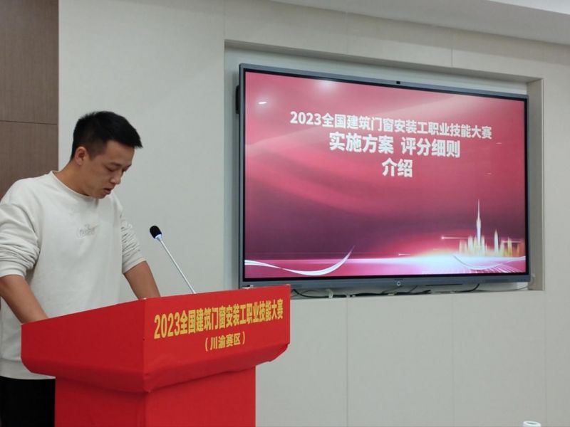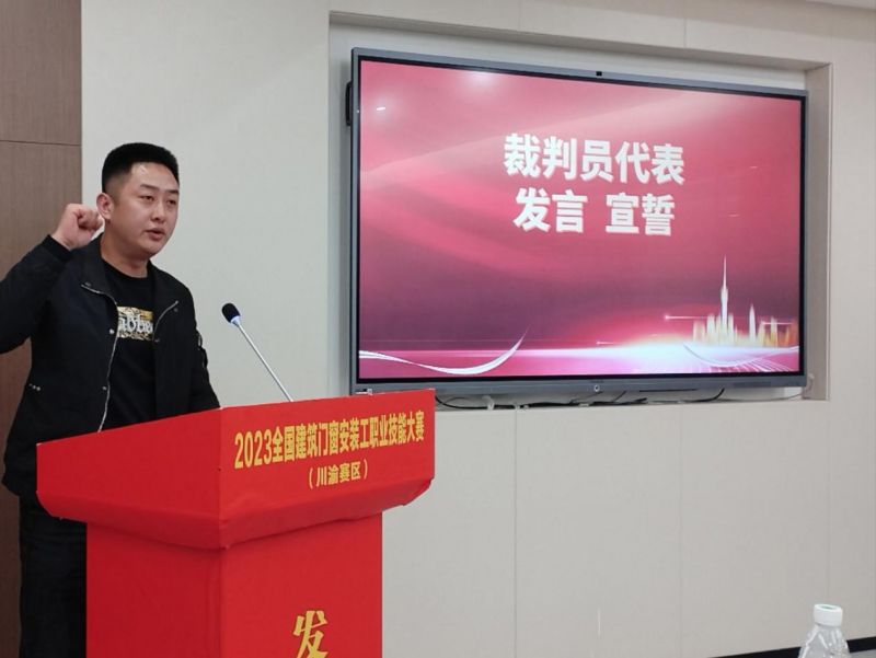 裁判員代表發表了評審專家(裁判員)宣言,將全心全意地為本次比賽做好評審工作,在此評審中將嚴守公開、公平、公正的原則,遵照評分細則,嚴肅認真、高度負責地完成好評委職責,并自愿接受大家的監督,全體評委尊重每位參賽選手,文明評審,秉公辦事,圓滿完成本次建筑門窗安裝工職業技能大賽川渝賽區的評審任務。
