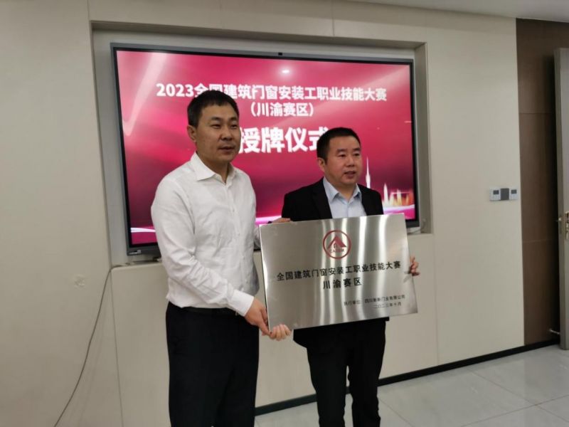 隨后,丁輝秘書長為四川新新門業頒發全國建筑門窗安裝工職業技能大賽川渝賽區牌匾。