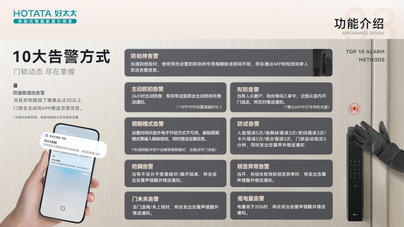 除了解鎖方式高度智能化,它還設計有十大告警方式,基本囊括了日常用鎖有可能遇到的痛點問題。比如平日里因為粗心或者有急事出門,匆忙中沒有關好房門,這時好太太智能鎖就會發出告警信號,提醒用戶關好房門,化解未知風險。還有這款好太太智能鎖搭載了厘米波雷達感應器,如果有人在門前徘徊,異常逗留,就會觸發偵測抓拍功能,并把圖像信息實時推送到手機。隨時隨地都能了解家門外的狀況。