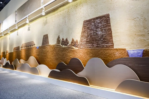 以木為基,以舟為始,從良渚先民打造獨木舟穿梭于內外城探索更廣闊的世界,到千年舟從世紀之交駕舟啟航,5000年文化積淀,造就了千年舟獨特的文化審美與精神傳承。以新石器時代人類文明“玉器、狩獵、農耕、編織、圖騰”為靈感打造的全新花色鋪陳,刻畫出的一整個背景墻的歷史長圖,波瀾起伏間完整再現了千年前真實、立體、全面的中華文明圣地。