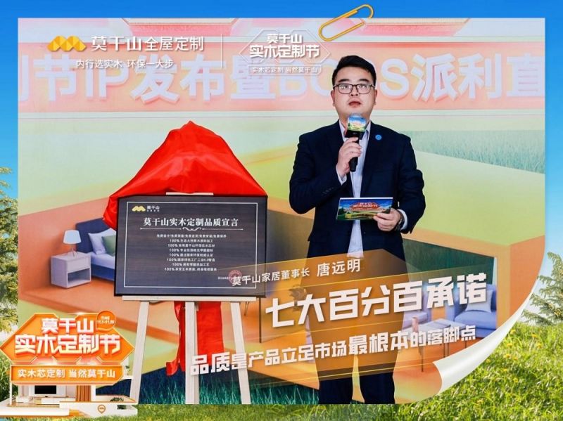 “實木芯定制,當然莫干山”,莫干山家居首屆實木定制節IP發布暨Boss派利直播于11月9日圓滿舉行,多重福利驚喜不斷。莫干山家居董事長唐遠明在會上鄭重宣讀了莫干山家居實木定制品質宣言并做出七大百分百承諾——莫干山家居堅持使用: