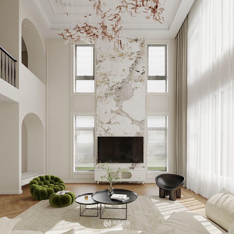 客廳區域的設計強調大氣與輕奢,設計師將一二樓區域的客廳空間打通,利用高度打造空間的磅礴感。色系則永優雅的奶油白,以中和空間帶來的壓迫感。