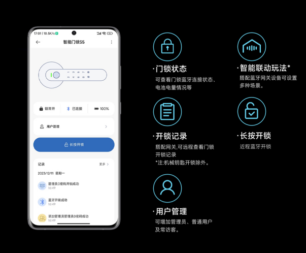 門鎖已接入米家,使用米家平臺可對門鎖進行管理控制,通過手機操作可實現常開模式的設置、遠程查看開鎖記錄、或者聯動其他米家生態智能產品,設置個性化場景聯動等。