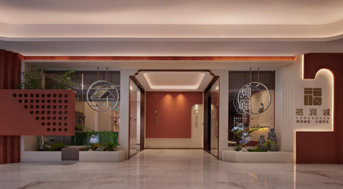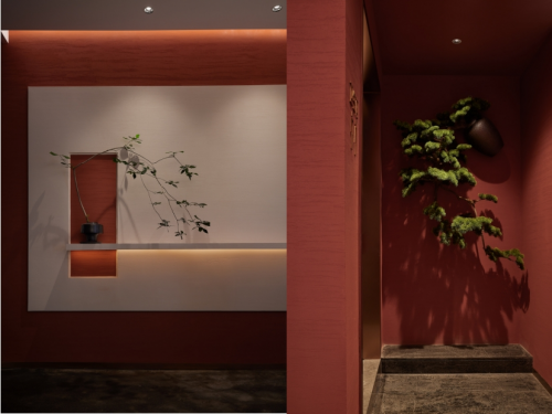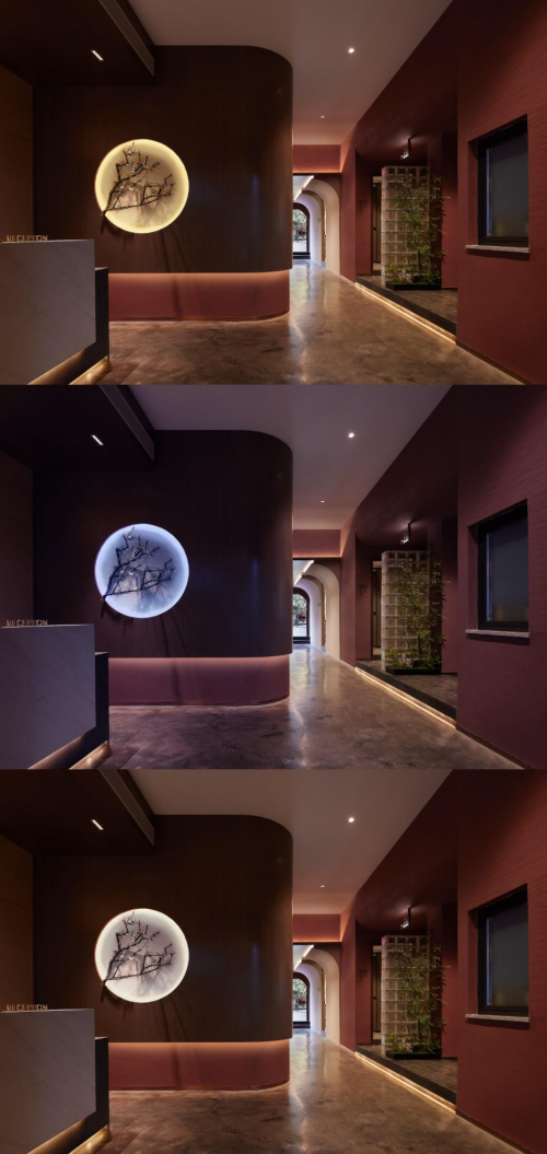 入口以朱砂色調為主,立面光源采用歐普UTMOST最新產品SDL燈帶,立面燈槽的細節設計讓內部光線擴散的更加柔和,使得其質樸自然的特性更加突出,增添了一抹精巧細膩的感覺,仿佛是一幅精致的藝術品。
