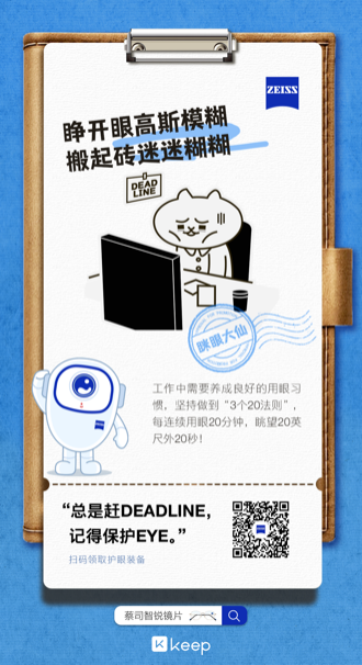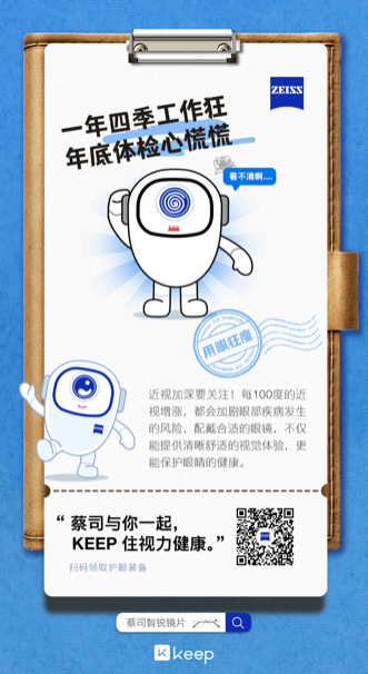 蔡司光學(xué)作為“職人季”合作伙伴,與Keep共同發(fā)起“職場(chǎng)診脈”的互動(dòng)體驗(yàn)報(bào)告,喚起職場(chǎng)人群保護(hù)眼健康的意識(shí)。蔡司光學(xué)一直致力于挖掘細(xì)分人群的用眼需求,為用戶(hù)提供專(zhuān)業(yè)的個(gè)性化解決方案,并通過(guò)跨界創(chuàng)新?tīng)I(yíng)銷(xiāo)模式不斷拓展用戶(hù)圈層。而Keep作為“運(yùn)動(dòng)科技第一股”,擁有大量熱愛(ài)運(yùn)動(dòng)的職場(chǎng)人士,蔡司光學(xué)借此契機(jī)成功對(duì)眼健康保護(hù)與視覺(jué)體驗(yàn)的關(guān)注,推廣給更精準(zhǔn)的職場(chǎng)人群,為Keep用戶(hù)提供個(gè)性化解決方案,精準(zhǔn)觸達(dá)潛在消費(fèi)人群,占領(lǐng)用戶(hù)心智。