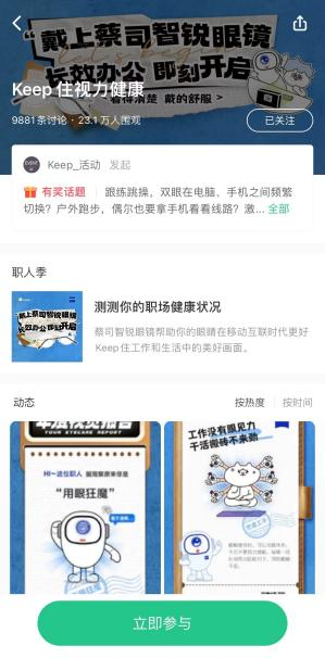 此次“職人季”創(chuàng)新跨界營(yíng)銷(xiāo)活動(dòng),共計(jì)吸引65萬(wàn)名用戶(hù)參與“職場(chǎng)診脈”活動(dòng),吸引超過(guò)13萬(wàn)名用戶(hù)進(jìn)行活動(dòng)分享,蔡司光學(xué)也向超過(guò)23萬(wàn)名用戶(hù)派發(fā)“護(hù)眼禮包”。蔡司光學(xué)在Keep的站內(nèi)話(huà)題#Keep住視力健康,也從23年8月以來(lái)累積吸引23萬(wàn)人關(guān)注,話(huà)題內(nèi)有超過(guò)1萬(wàn)名用戶(hù)分享運(yùn)動(dòng)用眼心得。