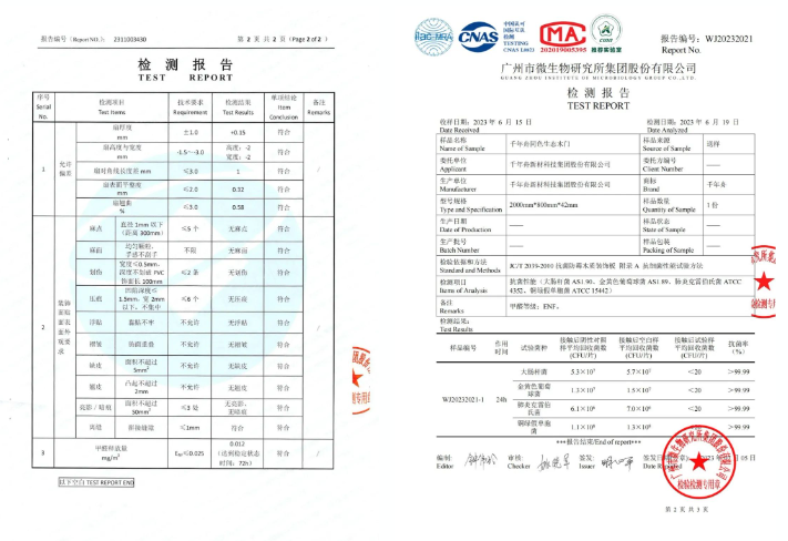 根據(jù)廣州市微生物研究所集團(tuán)股份有限公司檢測(cè)結(jié)果(報(bào)告編號(hào)WJ20232021),應(yīng)用自主研發(fā)的鋅效抗菌技術(shù)手段的千年舟木門飾面,針對(duì)大腸桿菌、金黃色葡萄球菌、銅綠假單胞菌、肺炎克雷伯氏菌等菌種,具備高達(dá)99.9%以上的抗菌效果。
