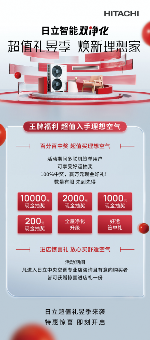 在315來臨之際,日立重磅推出“超值禮昱季 煥新理想家”鉅惠活動(dòng)。優(yōu)質(zhì)產(chǎn)品、勁爆優(yōu)惠、貼心服務(wù)應(yīng)有盡有,真真切切給消費(fèi)者一個(gè)放心選購的保障。2月24日—3月17日,正準(zhǔn)備家裝煥新的朋友們,遇到日立這場鉅惠福利,趕緊進(jìn)店參與活動(dòng)吧。王炸新品、十倍膨脹金、10000元現(xiàn)金補(bǔ)貼、免費(fèi)禮品直送...超多福利等你來薅!