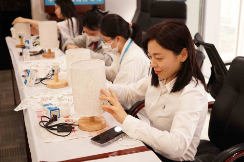 在南方公司總部,手工老師為大家詳細講解了蝶骨巴特的歷史淵源,并現場演示了制作方法。蝶骨巴特是一種裁剪紙張,是以裱貼為制作方式的工藝技術,其獨特的造型和精美的工藝一直深受人們喜愛。隨后,手工老師為大家分發了豐富的材料,包括各式花樣的紙張、膠水、剪刀和燈具等,并在燈面構圖、配花配色設計、制作方面進行手把手指導。