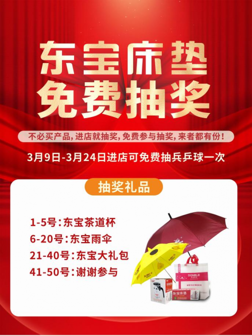 為感恩回饋廣大新老顧客一直以來對東寶床墊的支持與厚愛,3月9日-3月24日,東寶床墊東莞專賣店舉行免費(fèi)抽獎活動,不必買產(chǎn)品,進(jìn)店就可以免費(fèi)抽獎!