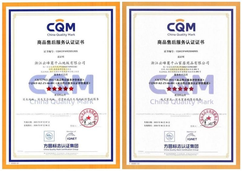 云峰新材聚焦高品質服務,對產品質量和售后服務嚴格把關,多年來的默默堅守和付出,贏得了廣泛的認可。2023年,經過專家組多輪嚴格審核,云峰新材憑借在實木地板、板式家具和實木家具等系列產品的優質售后服務,一舉通過國內知名認證機構——方圓集團的權威認證,榮獲“五星級”商品售后服務認證證書,獲得國家級權威資質認可。