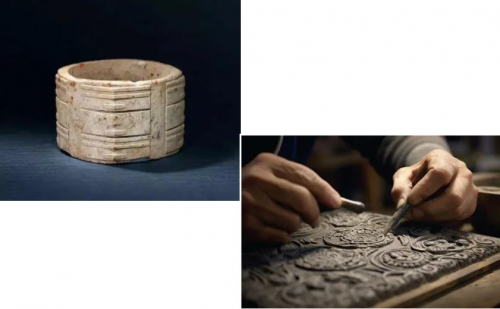 而月明千渚花色的設計則將良渚先民們的表情、符號、圖騰等元素提煉成線條,這些來自陶罐、玉器、墻壁的手刻記錄著先民美好生活的點滴。結合木紋底紋,刻符線條隱匿其間,仿佛還能感受到當年的余溫。這些指示刻符被認為是原始文字的雛形,猶如混沌世界中的智慧火花,照耀著五千年的不朽文明。