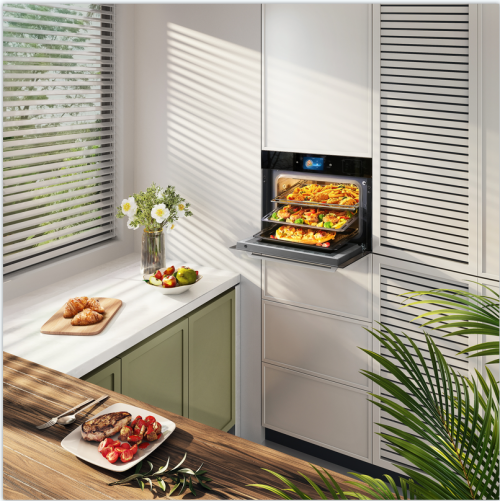 嵌入式蒸烤一體機。顧名思義嵌入到柜體中,它能做到產品和廚房環境融為一體,讓美觀性大大提升;其次,嵌入式蒸烤一體機空間要比臺式大,可以做到50L以上,滿足一家人或更多人聚餐使用,烹飪的效率高。同樣,選擇這類產品的用戶,需要在裝修階段就確定好型號,并與裝修木工溝通好預留尺寸。