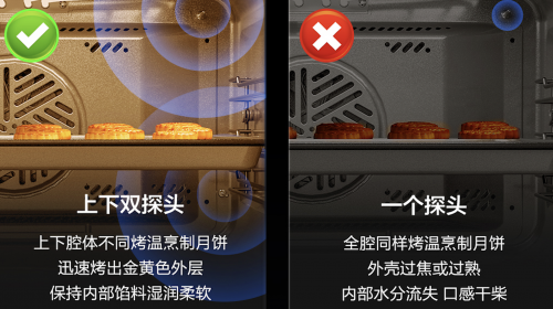 有時候在烘烤過程中,要對溫度有著非常精準的控制,比如烤披薩,上層溫度要達到180度,下層為200度,溫差達到20度才能保證披薩咬起來上層松軟下層酥脆。怎么能達到精準控溫,這就要依靠腔內的溫控探頭,老板蒸烤炸一體機CQ9068上下各1個探頭,一共2個,可以精準控溫,這幾乎就是高端蒸烤炸一體機的標配了。很顯然,市場上一些較低端的產品,不會明確標注幾個溫控探頭,這種基本就是1個,而這也意味著你不能用它來做復雜的美食。