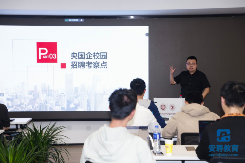 講座現場,安聘教育聯合創始人張凱元老師憑借其近10年的央國企及世界500強人力資源管理經驗,為學子們詳細解析了央國企就業的獨特優勢,包括穩定的職業發展、優厚的福利待遇、完善的培養體系等。