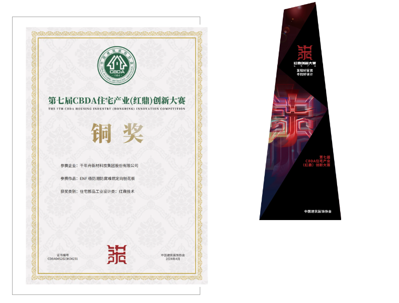 在紅鼎創新大賽發布環節,千年舟旗下“ENF 級防潮防腐難燃定向刨花板”榮獲“住宅部品工業設計類紅鼎技術銅獎”。