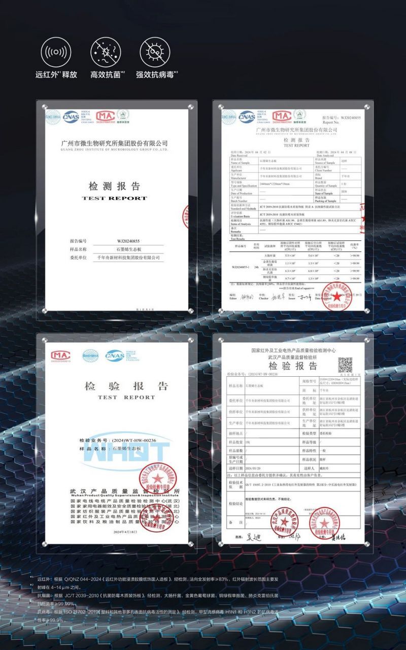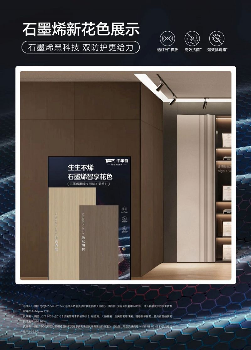 石墨烯,這一被譽為“黑金”的神奇材料,以其優(yōu)異的光學、電學、力學性能,以及出色的生物抑制性和化學穩(wěn)定性,正在引領一場材料科學的革命。千年舟將這一前沿科技融入家居裝飾,推出市場首例石墨烯花色系列產(chǎn)品,為您的家居生活帶來前所未有的健康體驗。