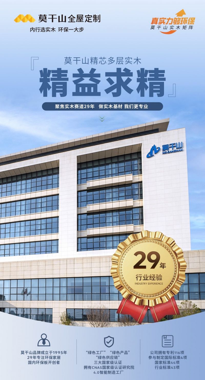 莫干山品牌成立于1995年,作為國內(nèi)環(huán)保板材的開創(chuàng)者,29年持續(xù)深耕實(shí)木芯材,公司擁有CNAS國家級(jí)認(rèn)證研究院,并獲得“綠色工廠”、“綠色產(chǎn)品”、“綠色供應(yīng)鏈”三大國家級(jí)認(rèn)證。