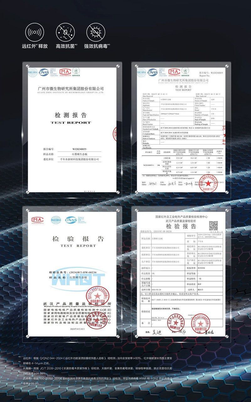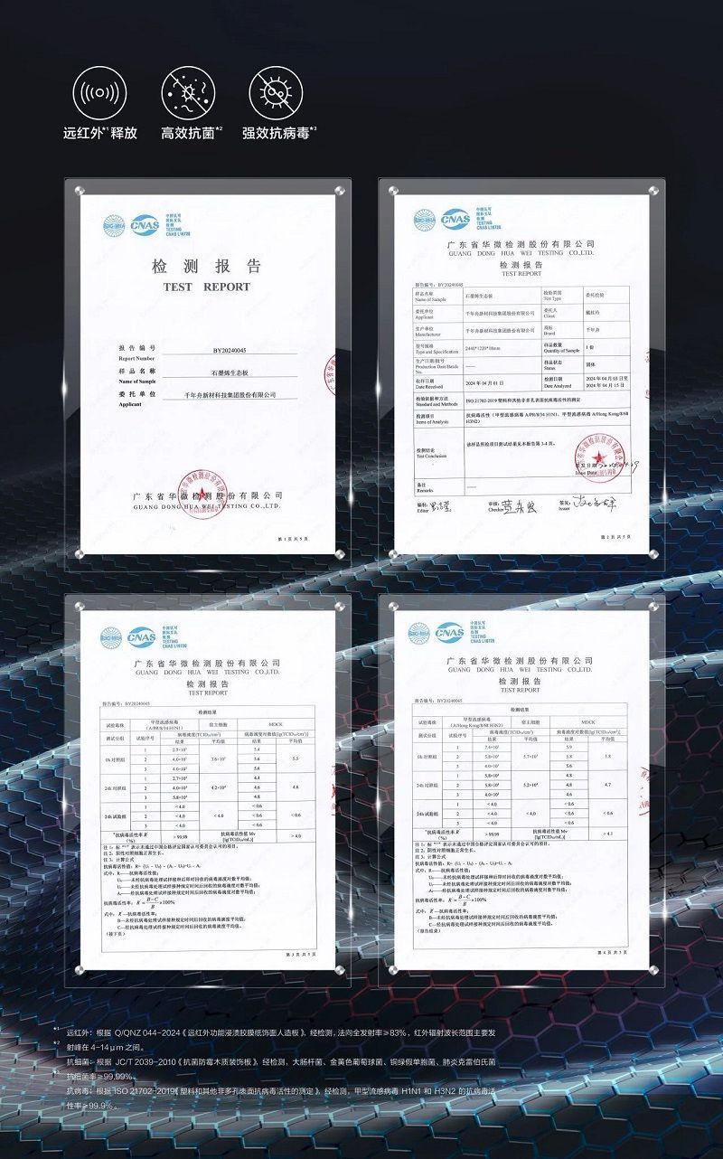 經(jīng)第三方權(quán)威機(jī)構(gòu)檢測,千年舟石墨烯生態(tài)板對大腸桿菌、金黃色葡萄球菌、銅綠假單胞菌、肺炎克雷伯氏菌抗細(xì)菌率≥99.99%;對甲型流感病毒H1N1和H3N2的抗病毒活性率≥99.9%,具有優(yōu)良的抗菌、抗病毒功能,能夠有效守護(hù)全家人的四季健康。