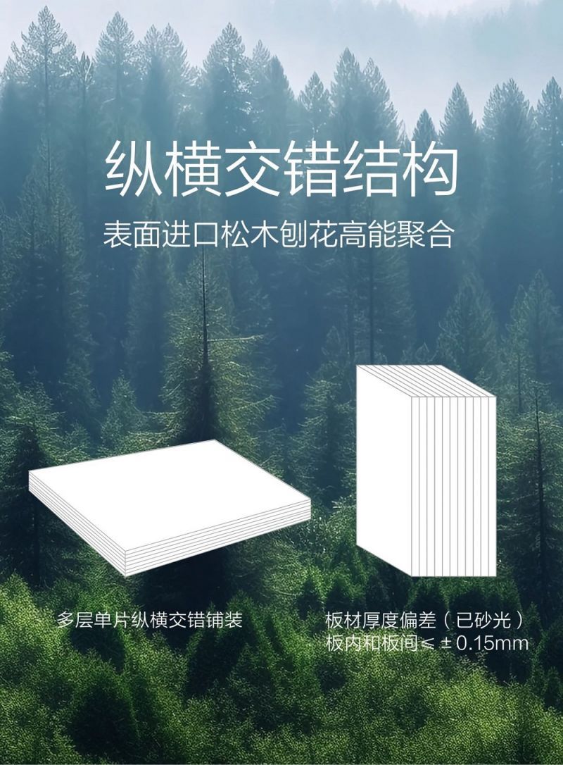 飾能板飾面系列嚴選天然優質木材,板芯采用多層全桉木縱橫交錯結構,表面進口松木刨花高能聚合,翹曲度≤12mm,板面平整,性能穩定。品質趕超大多數同類產品,環保水平達到ENF級,品質有保障,健康更安心。
