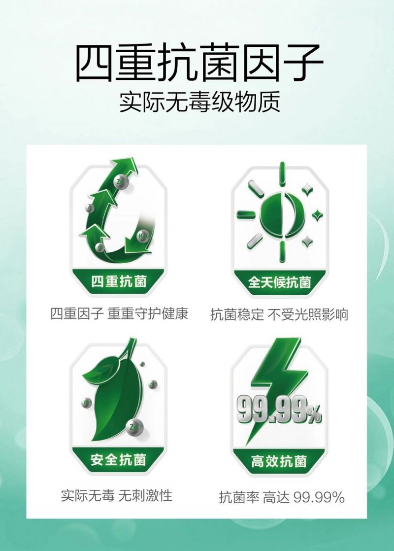 采用無毒無刺激性的“鋅”效抗菌技術,經第三方權威機構檢測板材對大腸桿菌、金黃色普通球菌、銅綠假單胞菌、肺炎克雷伯氏菌抗菌率高達99.99%,四重抗菌效果,起效條件不受光照影響,24小時全天不間斷抗菌。