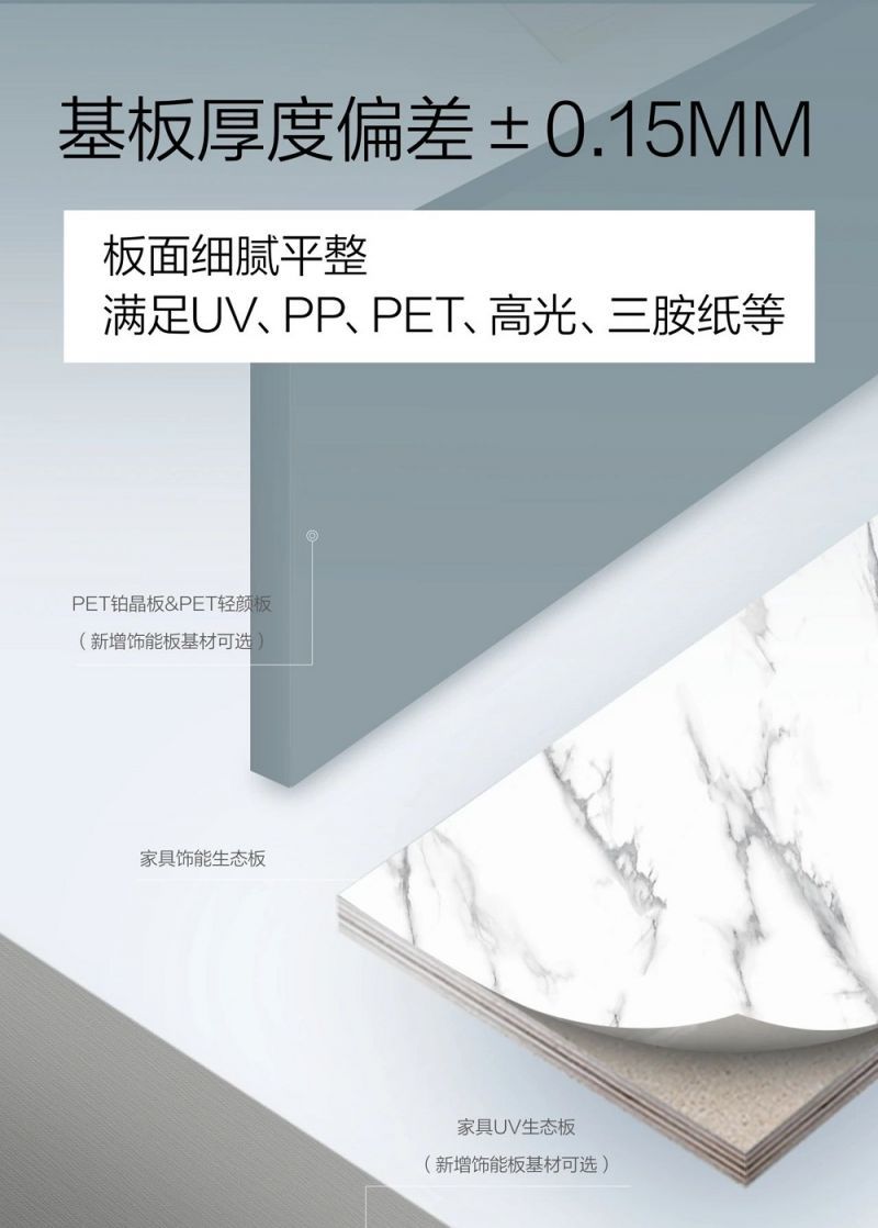千年舟飾能板飾面系列基板厚度偏差±0.15mm,表面細膩超平整,可滿足UV光固化、PP、PET、高光、三胺紙純色等不同飾面加工工藝,飾面精美,時尚繽紛,滿足各種個性需求,可廣泛適用在全屋定制家具及超高門板制作。