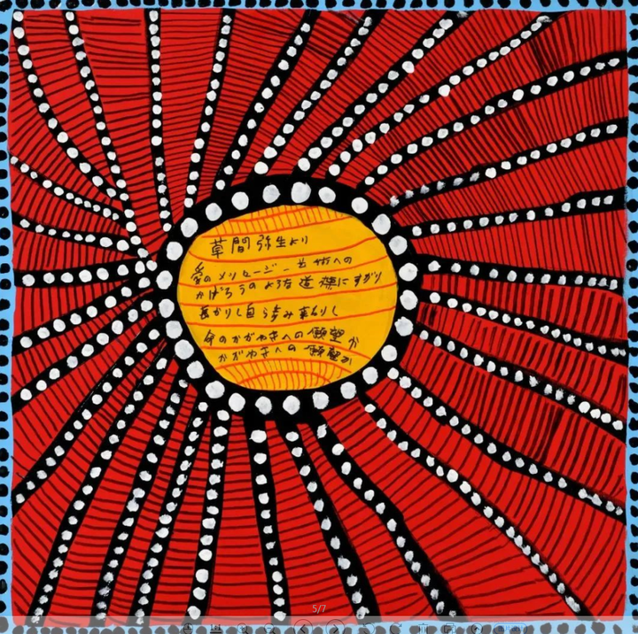 此次展覽是草間彌生在上海大田秀則畫廊洛克·外灘源新址的首展,將呈現其自2021年以來積極創作的《每天我都為愛祈禱》系列中的56幅繪畫以及新手稿。她以“文字”的形式更新了自己的表達語言。在網、點、側臉等代表性圖案重復出現的同時,草間經常將馬克筆和丙烯顏料混合使用,在畫布上畫出一個或多個圓,并用日語或英語在圓中寫上自己的詩和信息。筆觸輕重緩急生動地傳達了她的呼吸節奏。這些文字充滿了詩人草間對生命的無限渴望和與世界分享藝術的意愿,以及對自身死亡的感知。