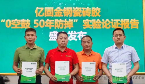 《億固金鋼瓷磚膠0空鼓50年防掉品質論證報告書》于5月10日盛大發布。從左至右:億固集團湛江運營中心負責人 蔡總、億固集團董事長 董總、億固集團茂名運營中心負責人 謝總、福州大學黃偉教授