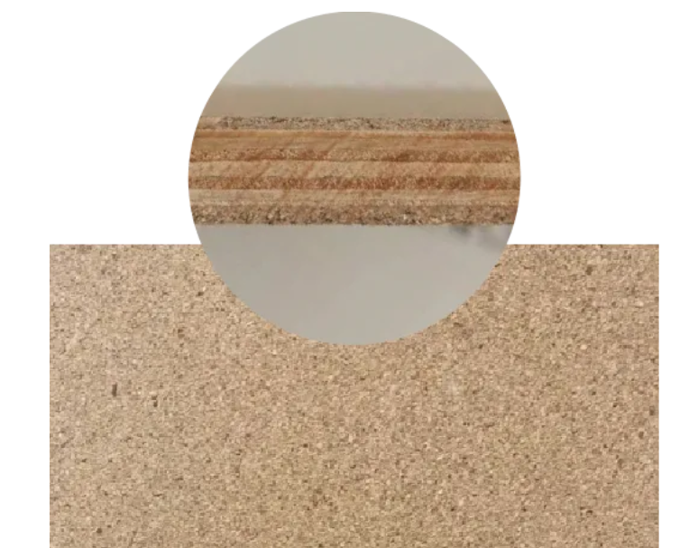 千年舟飾能板飾面系列基板芯材結構,經加工后鎖定8-16%黃金含水率,更好的適應氣候變化。同時板材表面松木細刨花高能聚合形成穩定表面層,能有效改善板材表面龜裂、開裂問題。