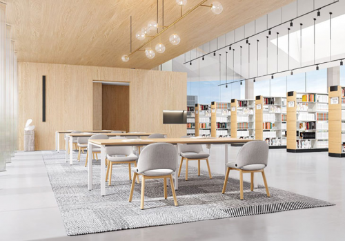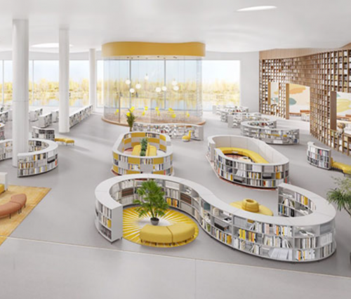 在圖書館設計中,引入了模塊化軟體沙發和小型茶幾,以及弧形書架和挑高平臺,營造出輕松愉悅的學習氛圍,使學習變得更加生動有趣;產品均采用人體工學設計,能夠有效保護學生的脊椎和視力,課桌椅的高度可根據學生身高自由調節,確保學生保持正確的坐姿,減少長時間學習帶來的疲勞感;關注學生健康,致力于打造無醛空間,產品的原材料選擇均符合環保健康標準,且具有良好的耐用性和穩定性,為學生創造一個安全、健康的學習環境。